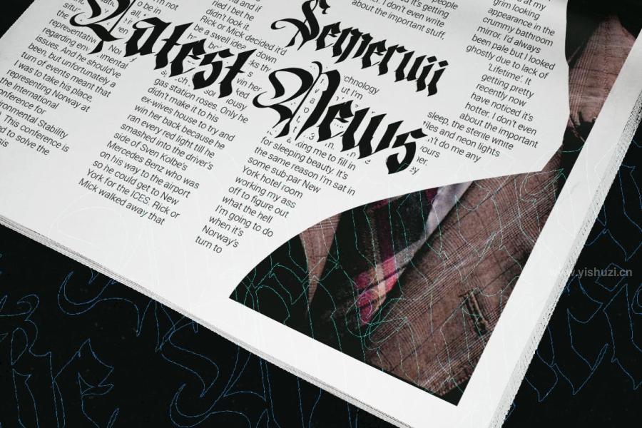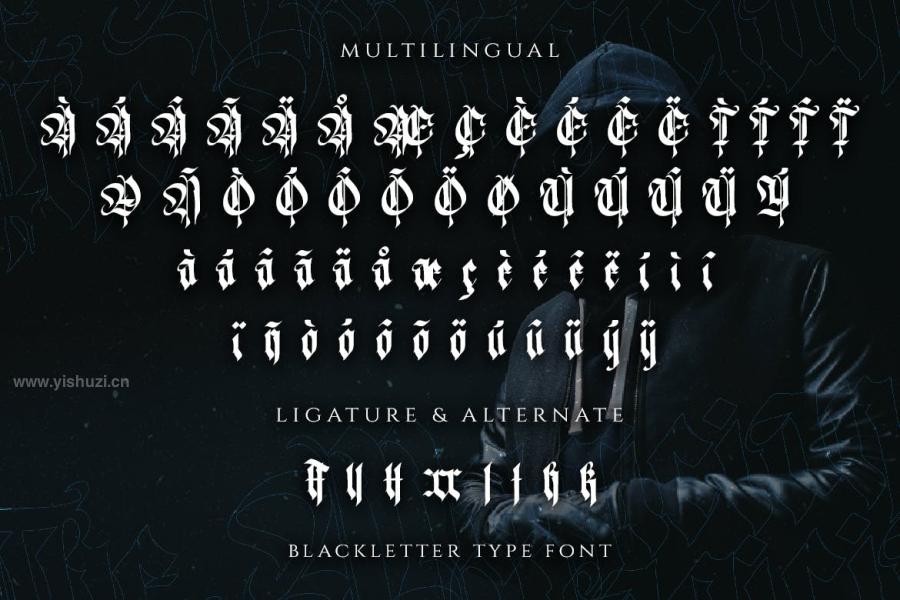 The Magician是一款暗黑主题哥特式的英文衬线体字体。经典的哥特式字形、标志性的边角设计,极具装饰感。用在您的画面中,非常有特色。适合暗黑主题、个性的项目设计应用。您可以用在海报、封面、标签、卡片、包装、书籍、服装等物品项目的设计中。素材包含大小写字符、数字、标点符号、连字符和多语言支持,提供otf、ttf和woff格式。
