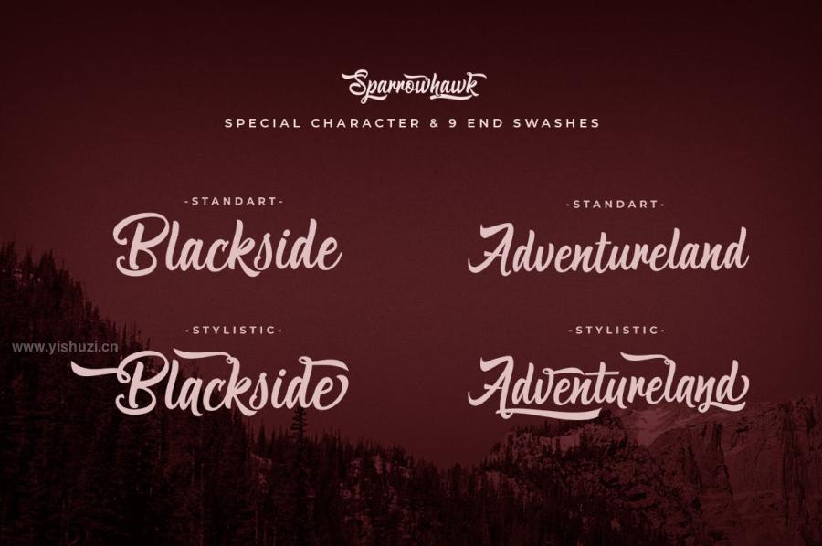 Sparrowhawk是一款柔和优雅复古的英文手写花体字体,包含500 多个字形和 264 个备用字符、连字、斜体和多语言支持。非常适合用于各种用途,如徽标、结婚请柬、信头、标牌、新闻、海报等。
